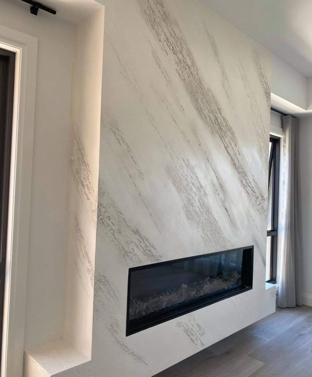 Immerse your living space in timeless sophistication with the exquisite touch of Venetian plaster, specifically designed for your fireplace. Our skilled artisans at FineLine Rendering Co. have meticulously applied the luxurious Mother of Pearl split stone Venetian plaster, creating a captivating and unique texture. This artisanal technique, blending the richness of marble dust and lime plaster, not only enhances the fireplace's visual appeal but also introduces an opulent ambiance to your home. As the flickering flames dance upon the textured surface, your fireplace becomes a focal point, a true masterpiece that seamlessly marries tradition with contemporary elegance. Elevate your living experience with the unparalleled beauty of Venetian plaster, transforming your fireplace into a symbol of refined luxury.